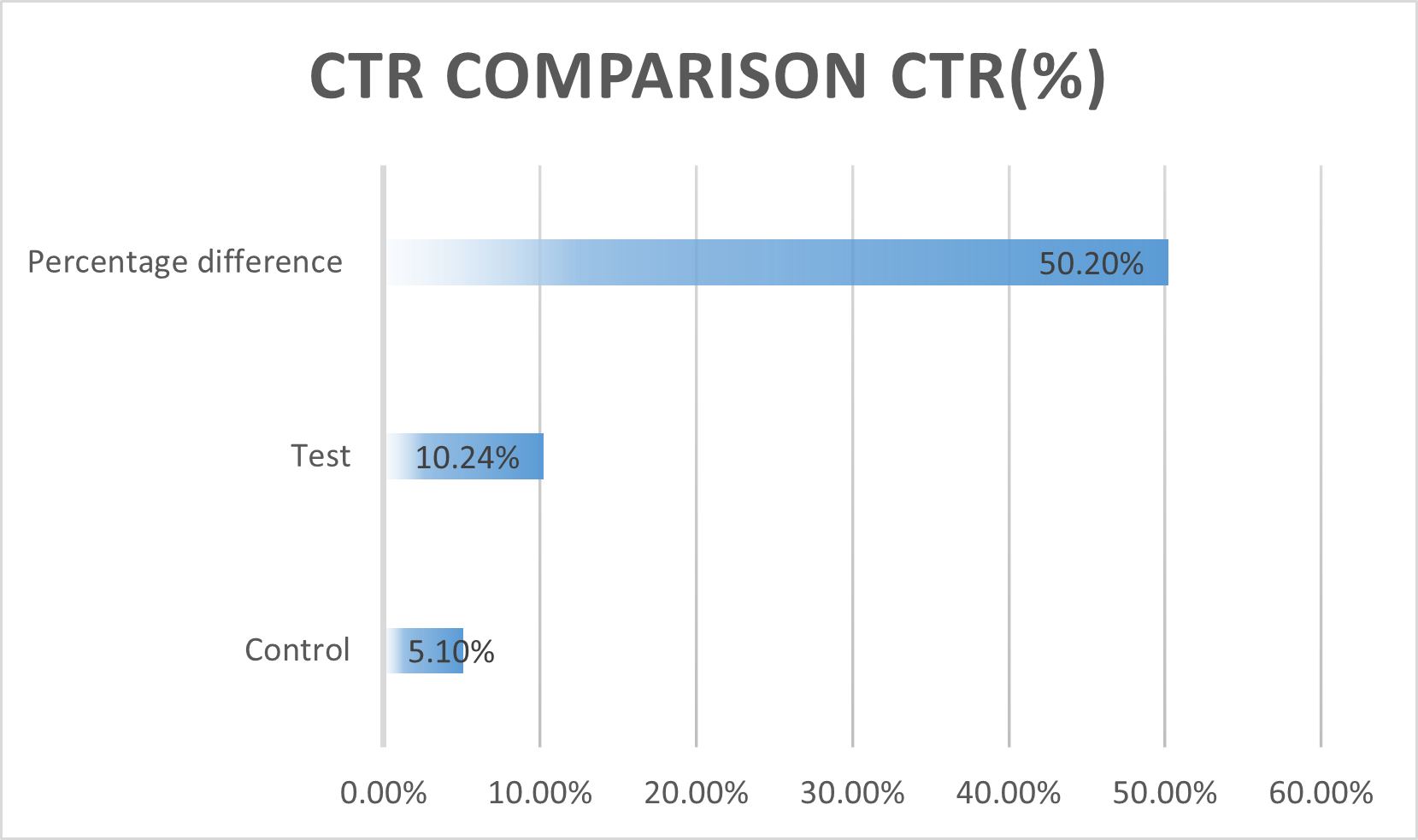 The Click-Through Rate (CTR) data reveals a significant difference between the Control and Test campaigns. The Control campaign achieved a CTR of 5.10%, while the Test campaign garnered a CTR of 10.24%. This translates to a 50.20% difference in CTR.