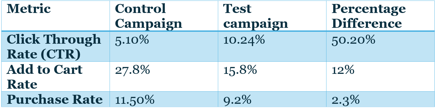 The A/B testing results offer valuable insights for optimizing website performance. The significant increase in CTR achieved by the Test campaign element demonstrates the power of crafting visuals and messaging to caputure user attention. However, the lower Add to Cart Rat and purchase rate of the test campaign highlight the importance of a seamless user experience across the entire conversion funnel.